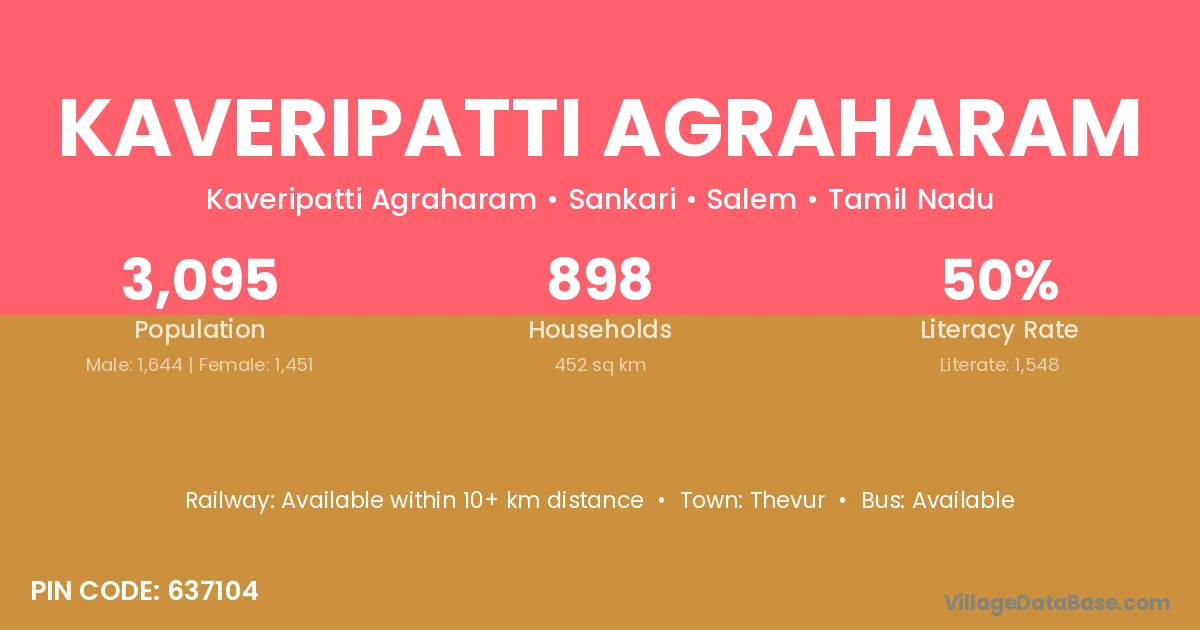 Kaveripatti Agraharam village has a total population of 3,095 people, of which 1,644 are males and 1,451 are females.
