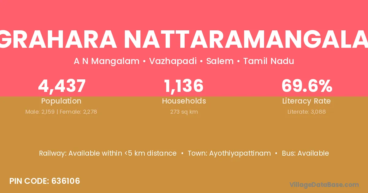 Agrahara Nattaramangalam village has a total population of 4,437 people, of which 2,159 are males and 2,278 are females.