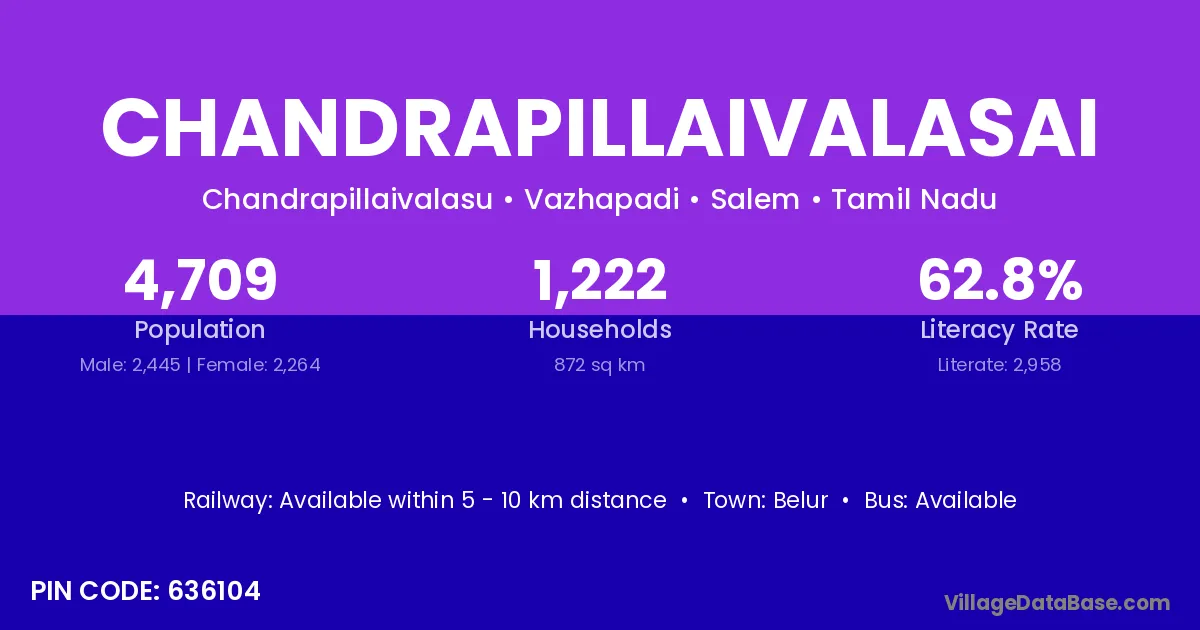 Chandrapillaivalasai village has a total population of 4,709 people, of which 2,445 are males and 2,264 are females.