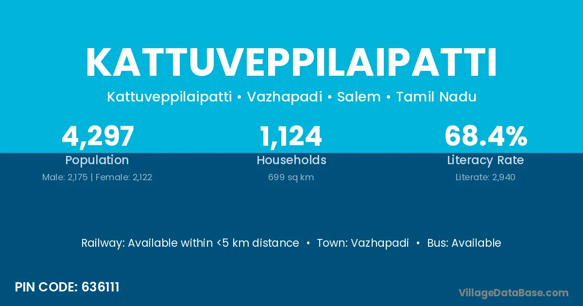 Kattuveppilaipatti village has a total population of 4,297 people, of which 2,175 are males and 2,122 are females.