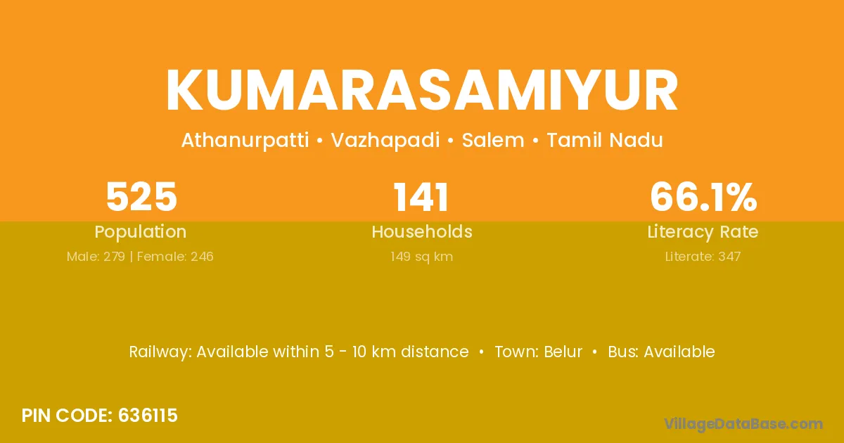 According to Census 2011 information, the village code of Kumarasamiyur village is 636115.
