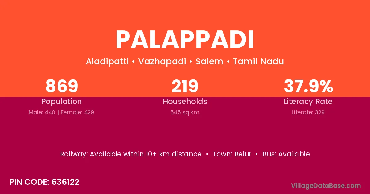 Palappadi village has a total population of 869 people, of which 440 are males and 429 are females.