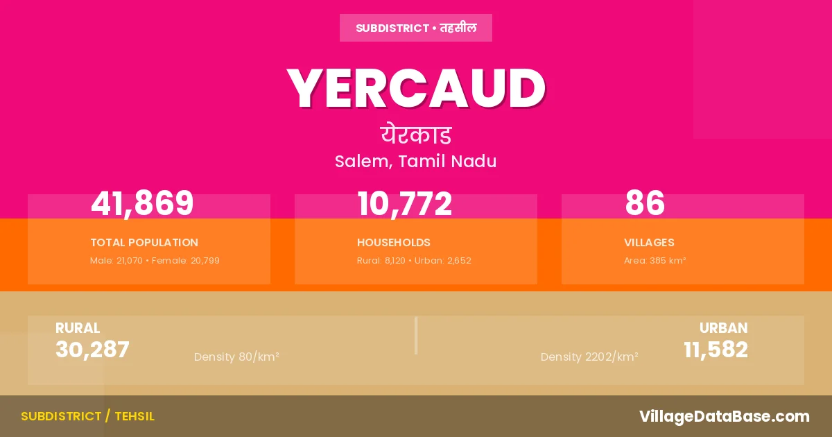 According to the 2011 census The total area of Yercaud Taluka is 385 km², with a population of 41869 people. The population density is 109 inhabitants per square kilometre, and there are approximately 10772 houses in the sub district.