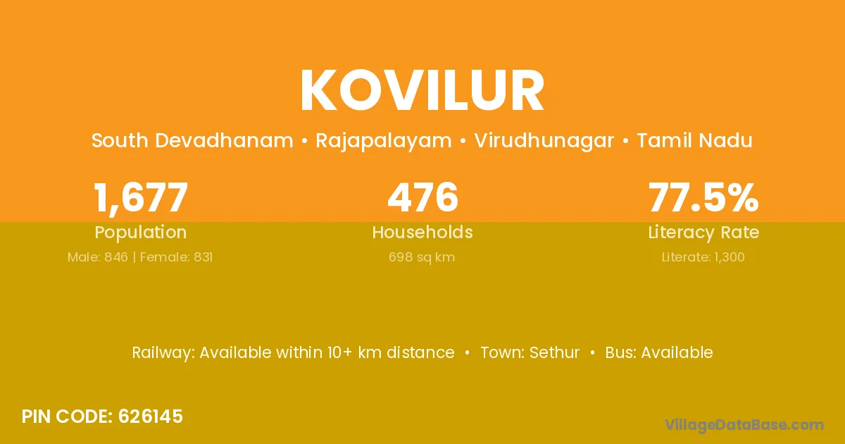 The literacy rate of Kovilur village is 32.96%. Male literacy stands at 41.21% and female literacy at 24.68%.