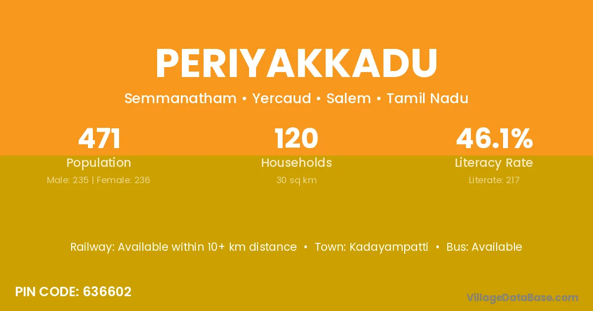 Periyakkadu village has a total population of 471 people, of which 235 are males and 236 are females.