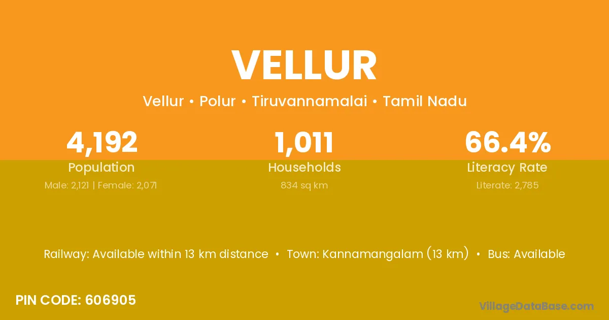 According to Census 2011 information, the village code of Vellur village is 636602.