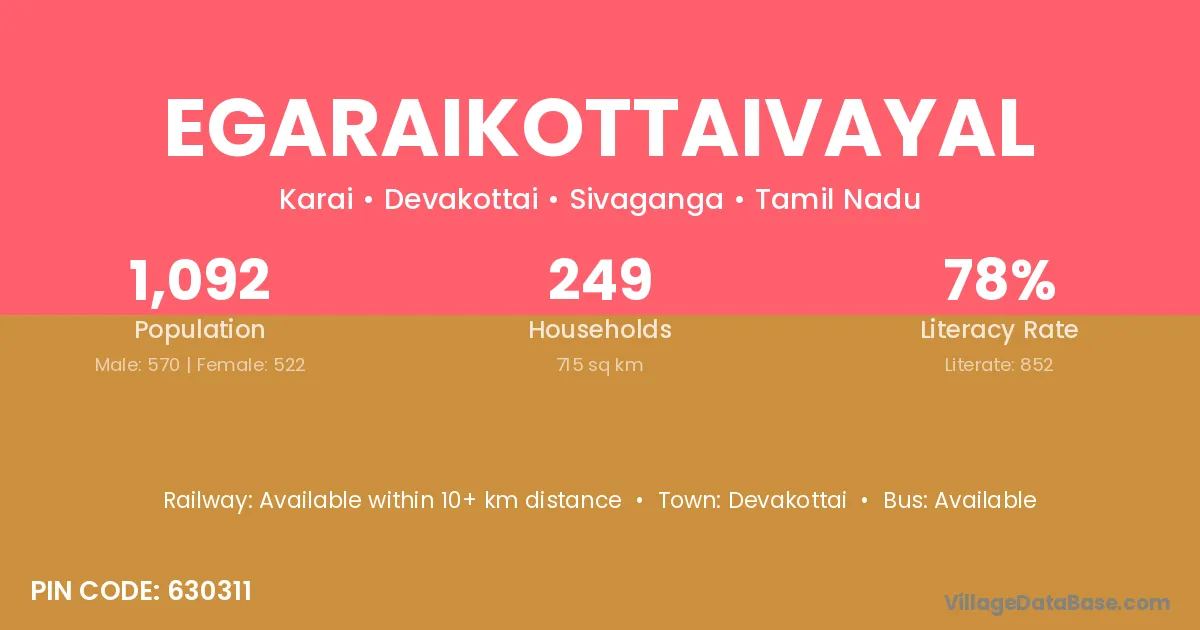 Devakottai is the nearest town to Egaraikottaivayal village for major economic activities