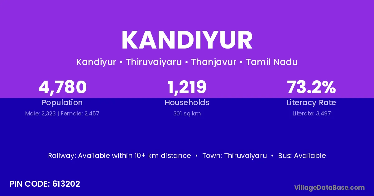 Kandiyur village has a total population of 2,904 people, of which 1,490 are males and 1,414 are females.