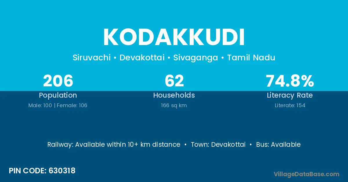 Kodakkudi village has a total population of 206 people, of which 100 are males and 106 are females.