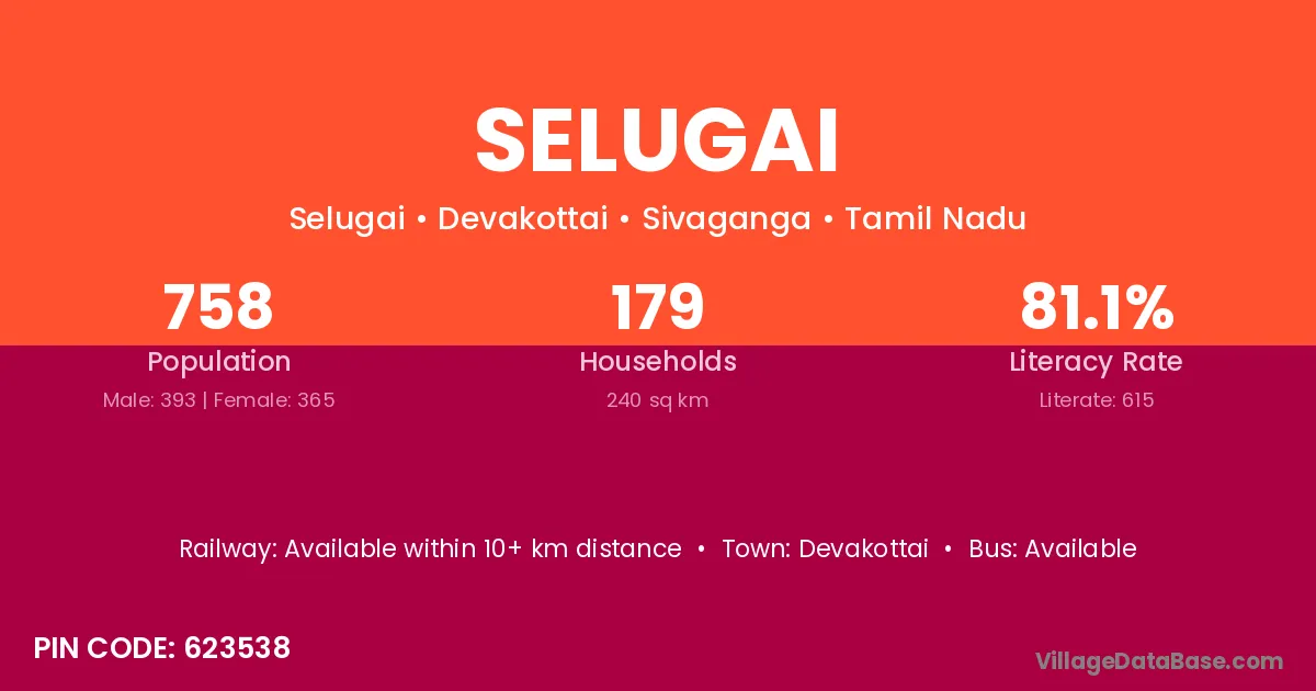 Selugai village has a total population of 758 people, of which 393 are males and 365 are females.