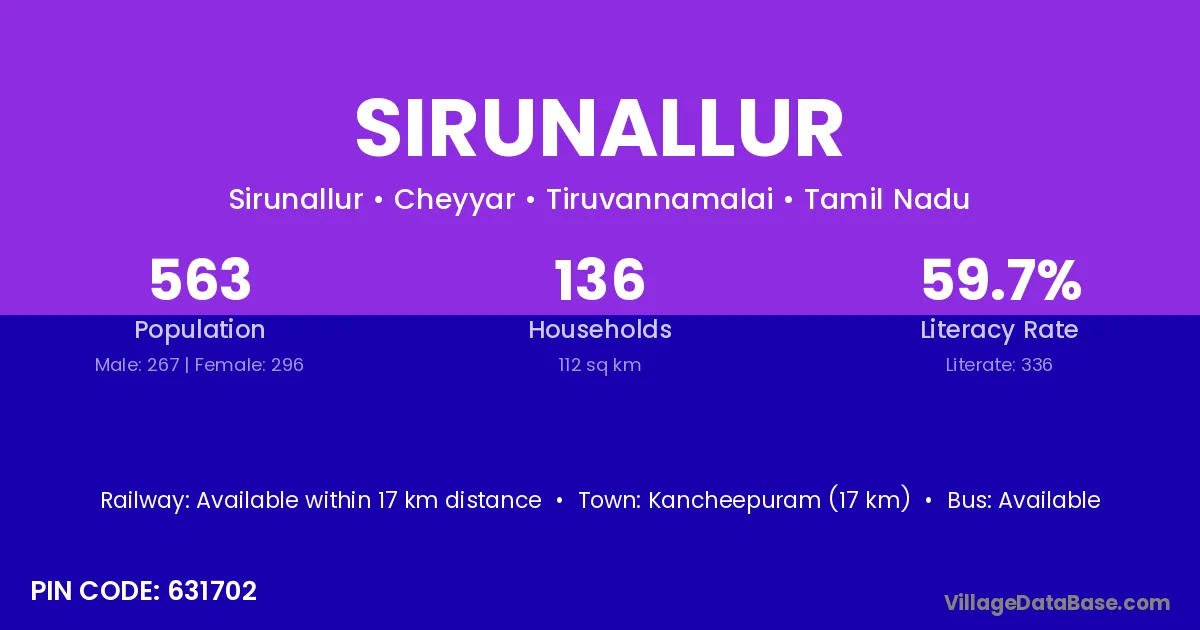 Sirunallur village has a total population of 1,215 people, of which 633 are males and 582 are females.