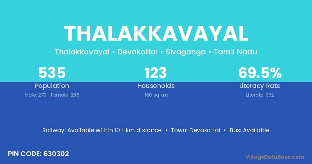 Devakottai is the nearest town to Thalakkavayal village for major economic activities