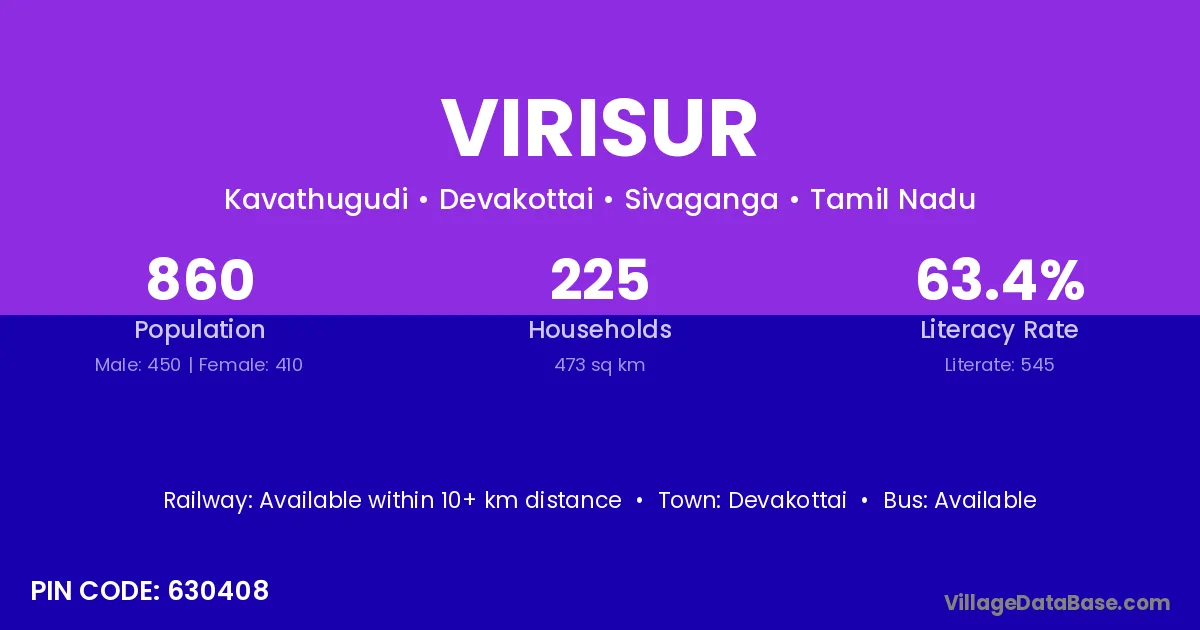 According to Census 2011 information, the village code of Virisur village is 630408.
