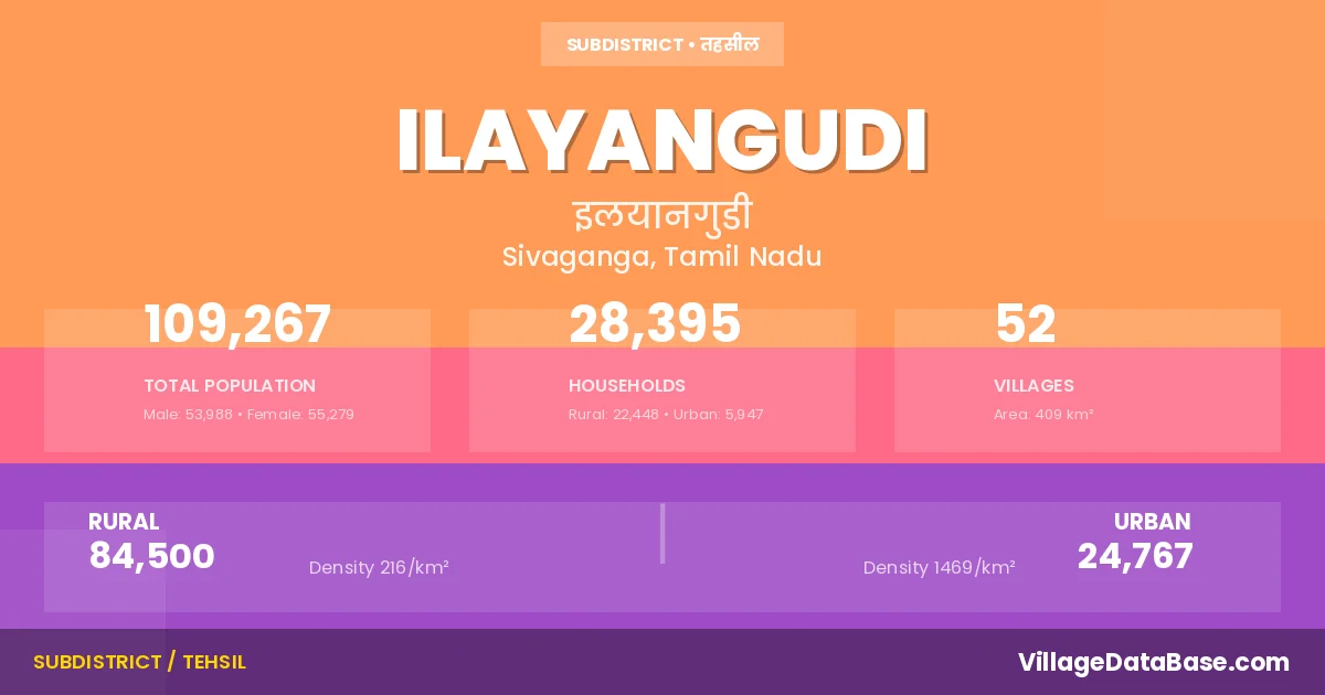 According to the 2011 census The total area of Ilayangudi Taluka is 409 km², with a population of 109267 people. The population density is 267 inhabitants per square kilometre, and there are approximately 28395 houses in the sub district.