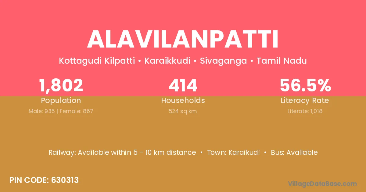 Alavilanpatti village has a total population of 1,802 people, of which 935 are males and 867 are females.