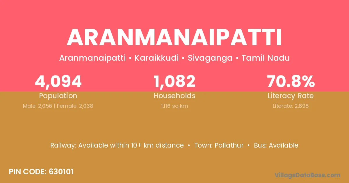Aranmanaipatti village has a total population of 4,094 people, of which 2,056 are males and 2,038 are females.