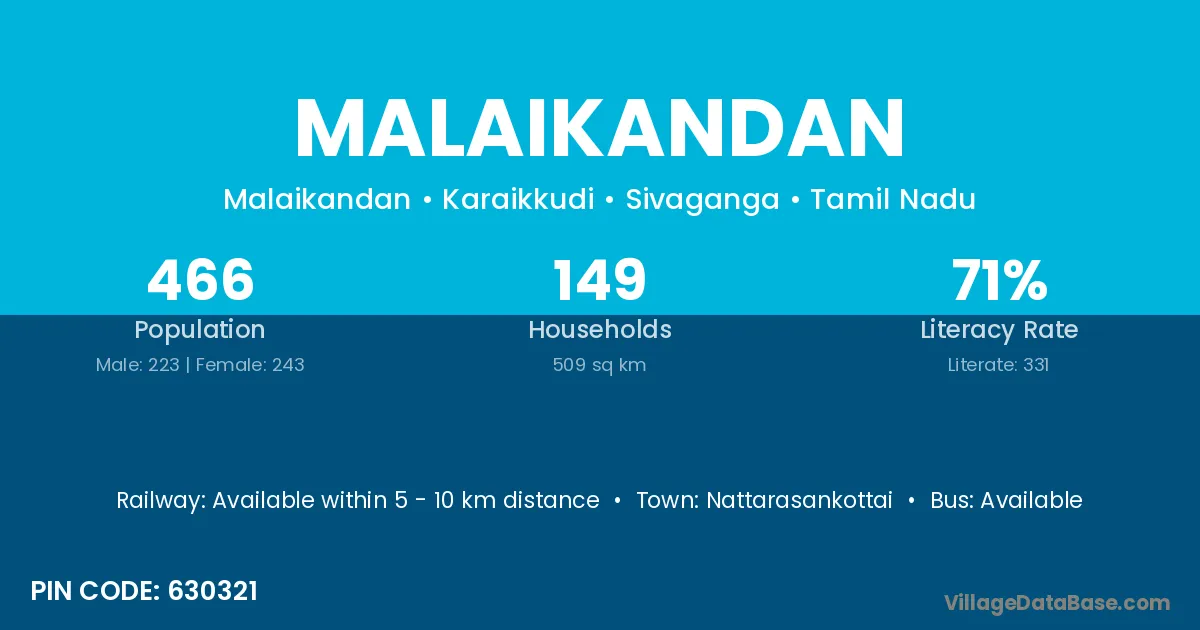 Malaikandan village has a total population of 466 people, of which 223 are males and 243 are females.