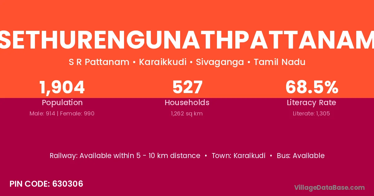 Sethurengunathpattanam village has a total population of 1,904 people, of which 914 are males and 990 are females.