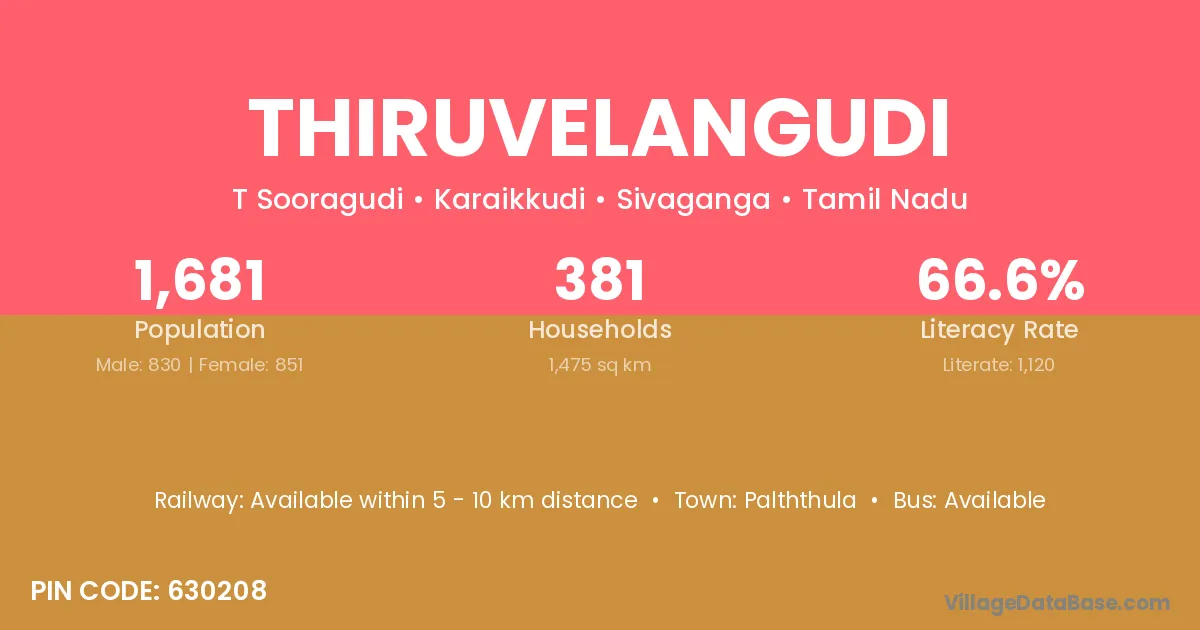 Thiruvelangudi village has a total population of 1,681 people, of which 830 are males and 851 are females.