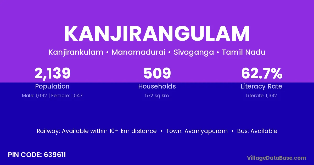 Kanjirangulam village has a total population of 2,139 people, of which 1,092 are males and 1,047 are females.