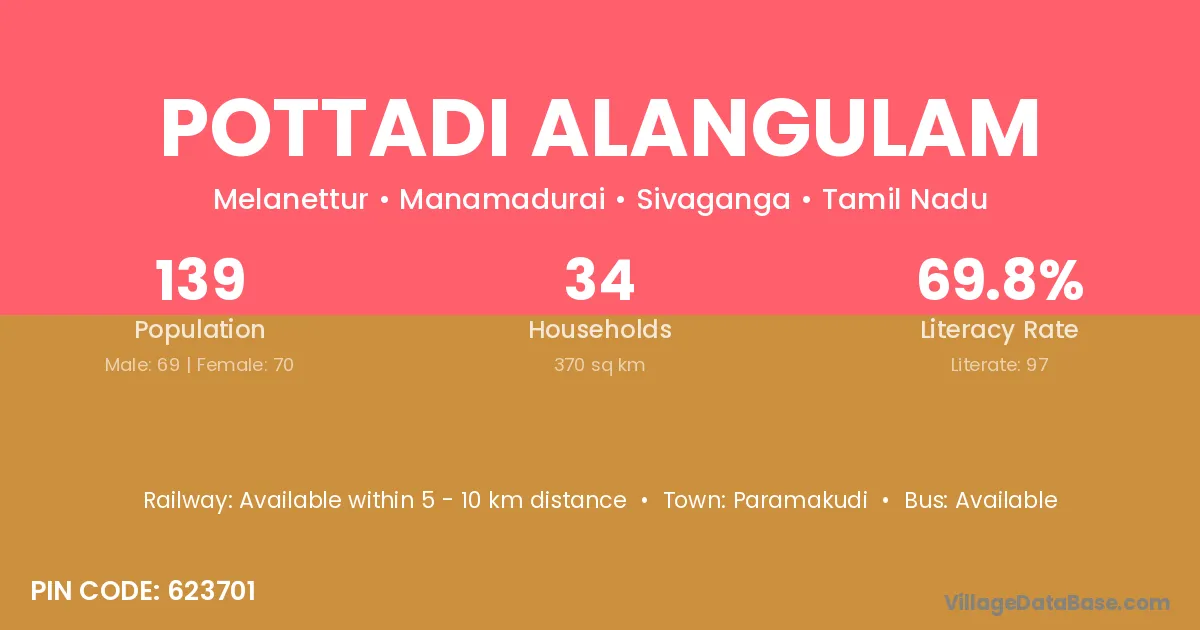Pottadi Alangulam village has a total population of 139 people, of which 69 are males and 70 are females.