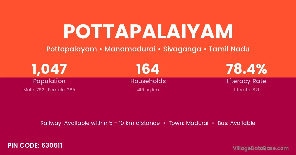 Pottapalaiyam village has a total population of 1,047 people, of which 762 are males and 285 are females.