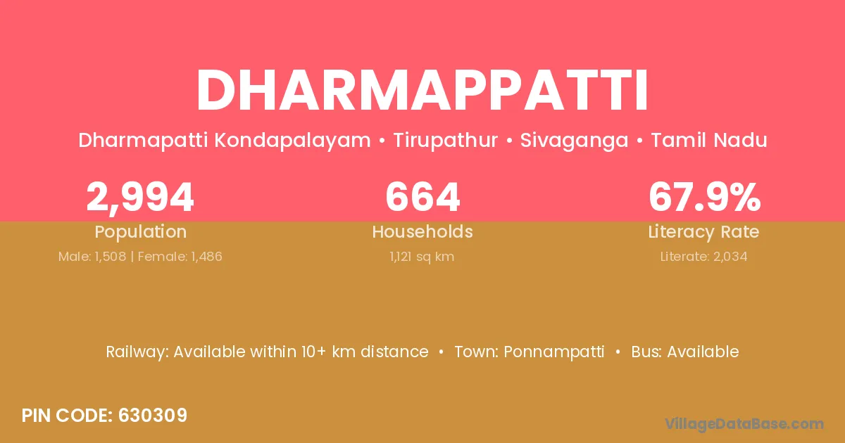 Dharmappatti village has a total population of 2,994 people, of which 1,508 are males and 1,486 are females.
