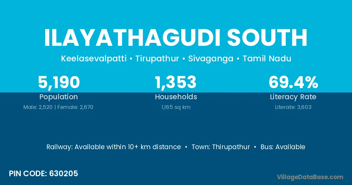 Ilayathagudi South village has a total population of 5,190 people, of which 2,520 are males and 2,670 are females.