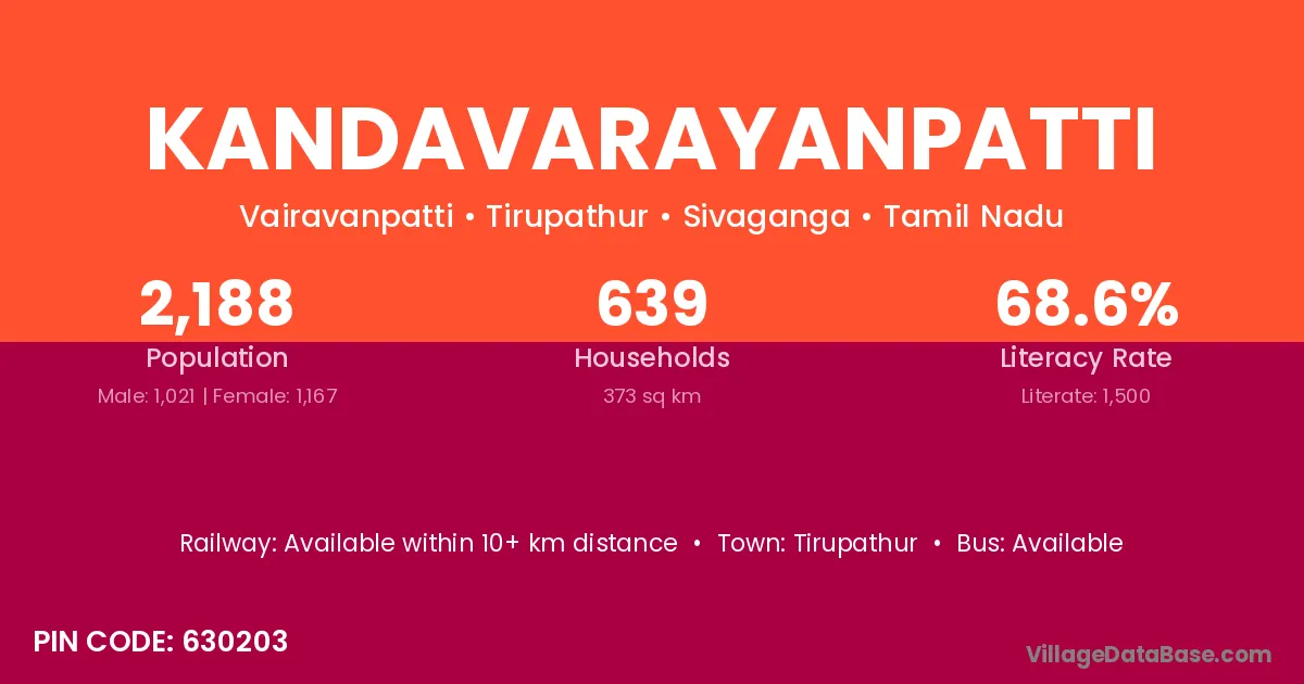 Kandavarayanpatti village has a total population of 2,188 people, of which 1,021 are males and 1,167 are females.