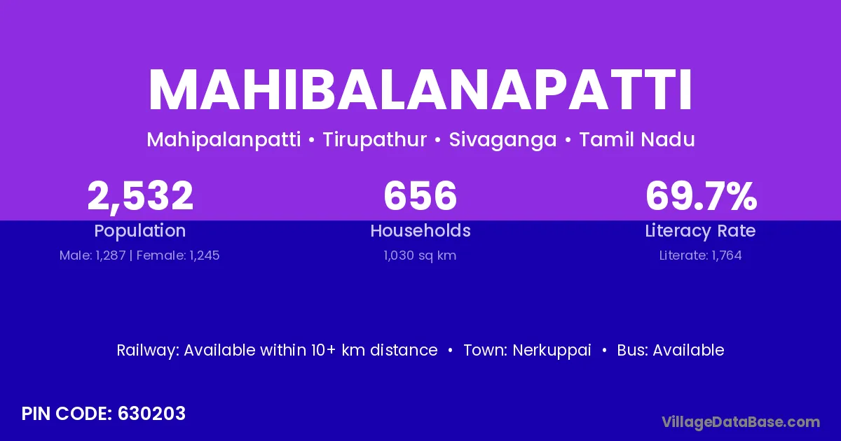 Mahibalanapatti village has a total population of 2,532 people, of which 1,287 are males and 1,245 are females.