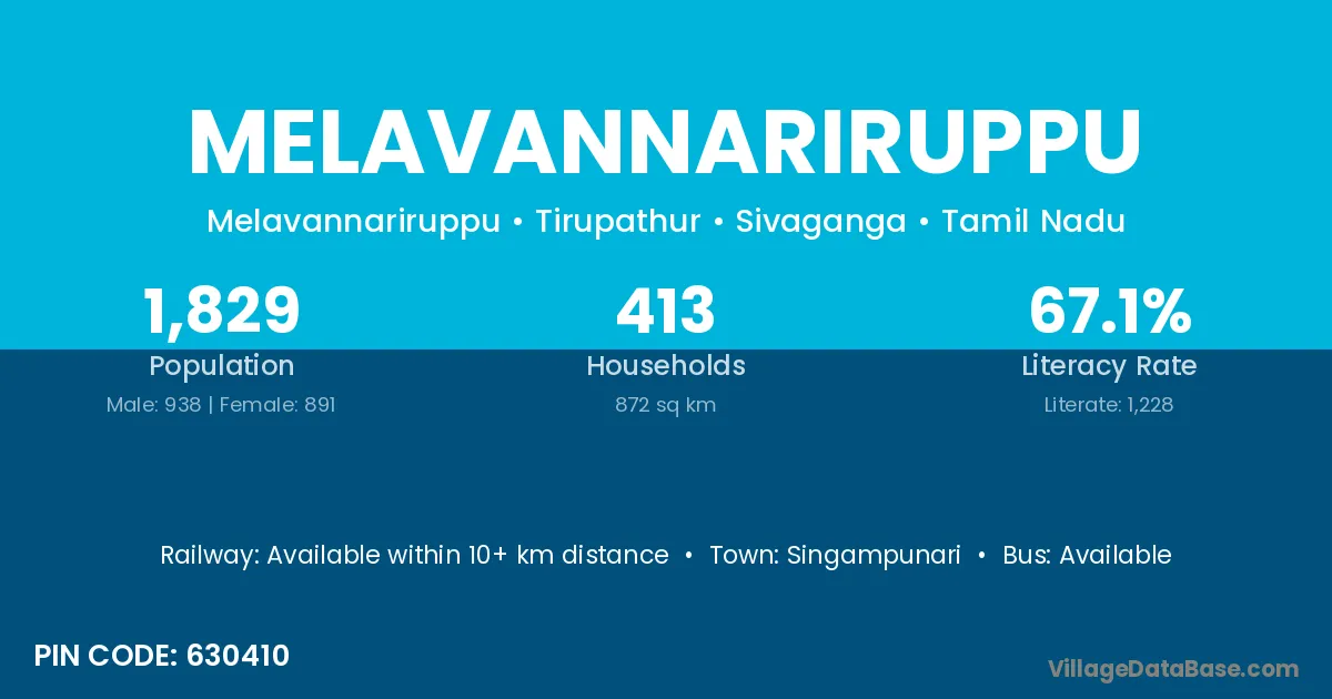 Melavannariruppu village has a total population of 1,829 people, of which 938 are males and 891 are females.