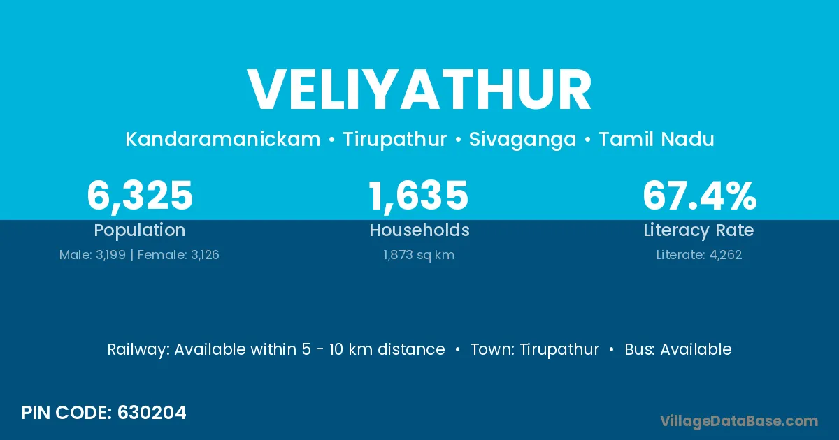 Veliyathur village has a total population of 6,325 people, of which 3,199 are males and 3,126 are females.