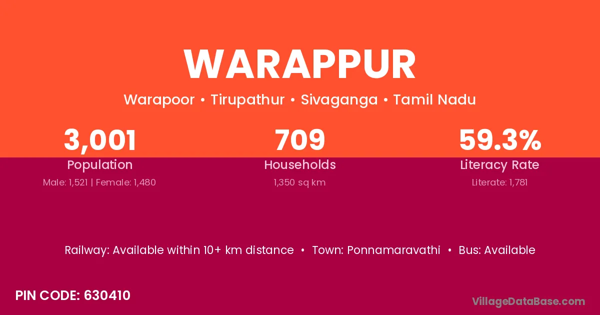 Warappur village has a total population of 3,001 people, of which 1,521 are males and 1,480 are females.