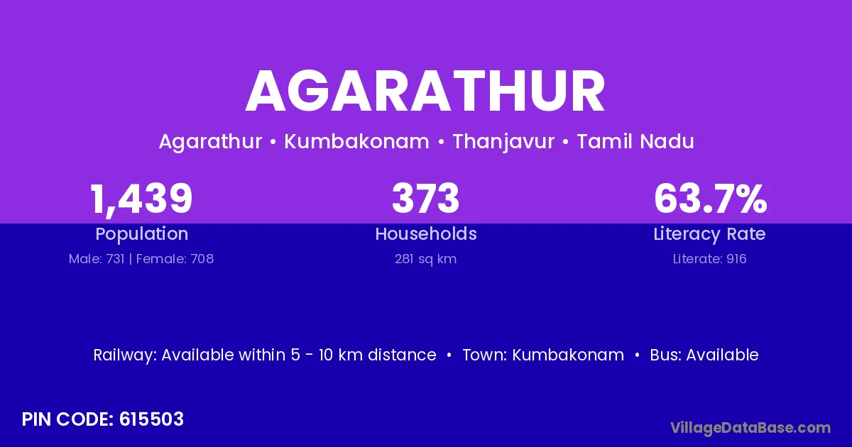 Kumbakonam is the nearest town to Agarathur village for major economic activities