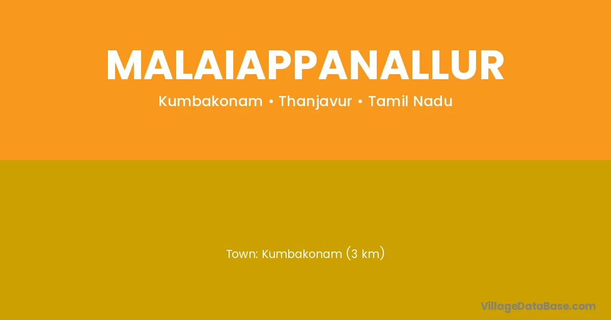Kumbakonam (3 km) is the nearest town to Malaiappanallur village for major economic activities and is located approximately 3 km away.