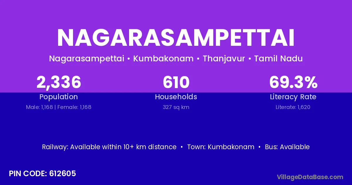 Nagarasampettai village has a total population of 2,336 people, of which 1,168 are males and 1,168 are females.