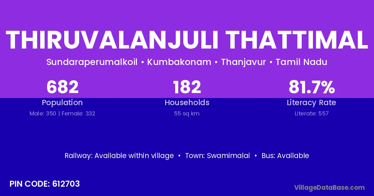Thiruvalanjuli Thattimal village has a total population of 682 people, of which 350 are males and 332 are females.