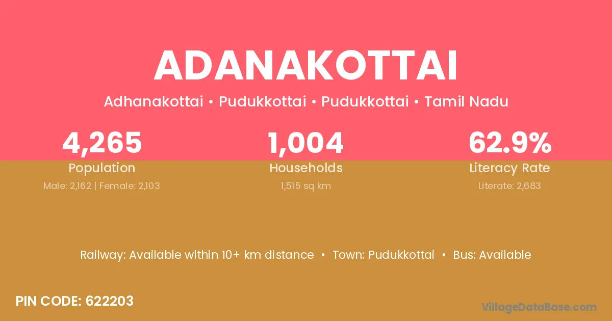 Adanakottai village has a total population of 1,975 people, of which 975 are males and 1,000 are females.