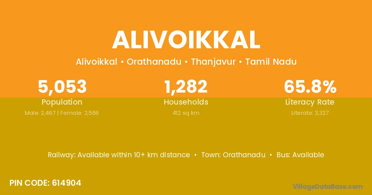Alivoikkal village has a total population of 5,053 people, of which 2,467 are males and 2,586 are females.
