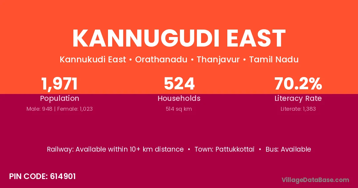 Kannugudi East village has a total population of 1,971 people, of which 948 are males and 1,023 are females.
