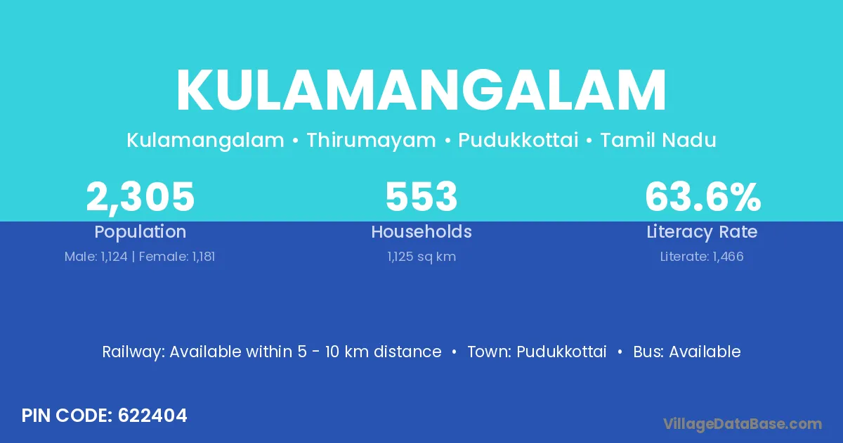 Kulamangalam village has a total population of 2,748 people, of which 1,382 are males and 1,366 are females.