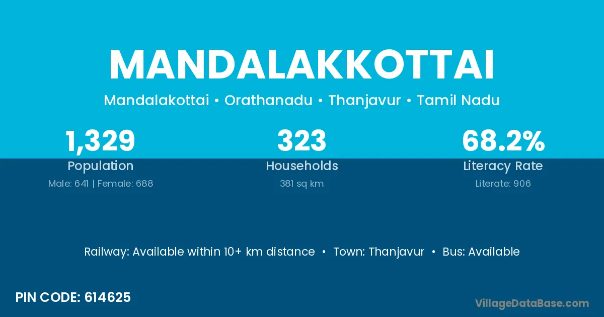 Mandalakkottai village has a total population of 1,329 people, of which 641 are males and 688 are females.