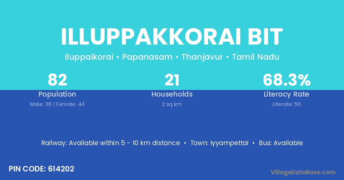 Illuppakkorai Bit village has a total population of 82 people, of which 38 are males and 44 are females.