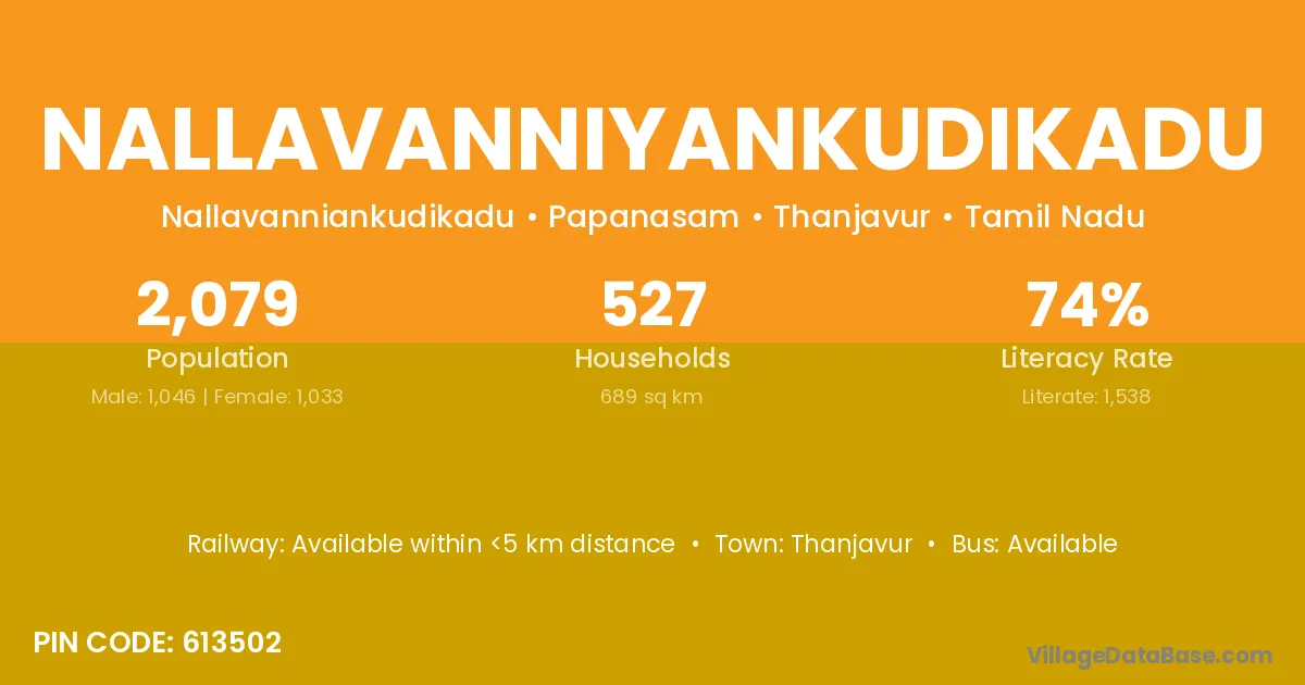 Nallavanniyankudikadu village has a total population of 2,079 people, of which 1,046 are males and 1,033 are females.