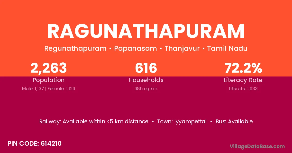 Ragunathapuram village has a total population of 2,263 people, of which 1,137 are males and 1,126 are females.