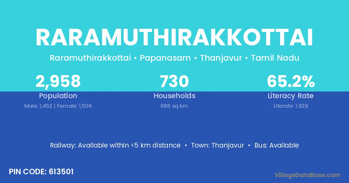 Raramuthirakkottai village has a total population of 2,958 people, of which 1,452 are males and 1,506 are females.