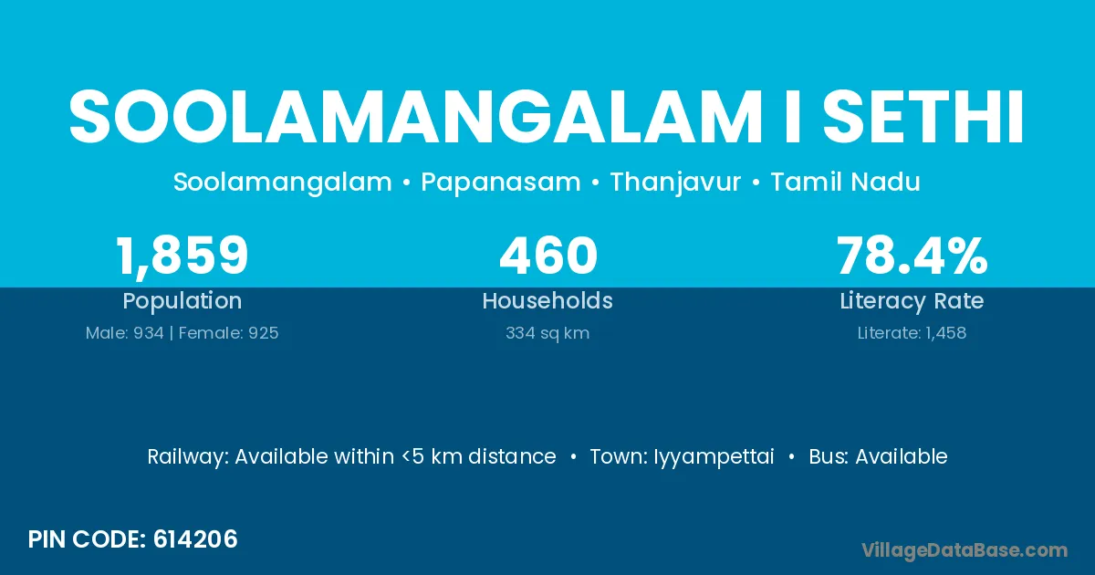 Soolamangalam I Sethi village has a total population of 1,859 people, of which 934 are males and 925 are females.