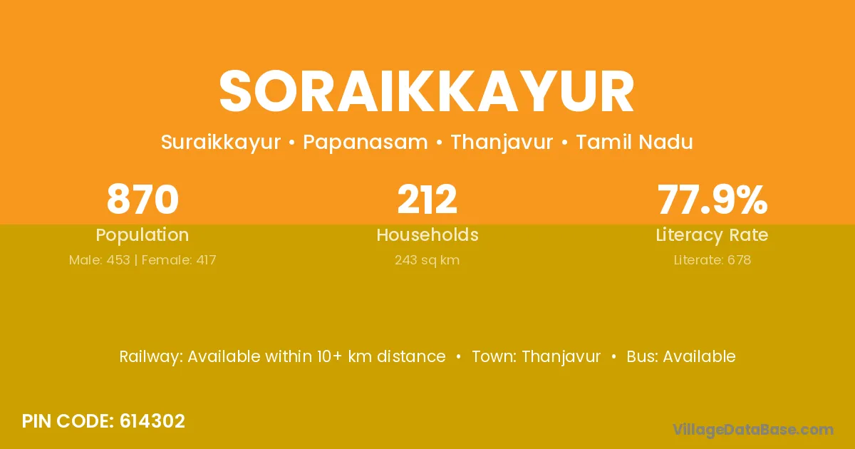 Soraikkayur village has a total population of 870 people, of which 453 are males and 417 are females.