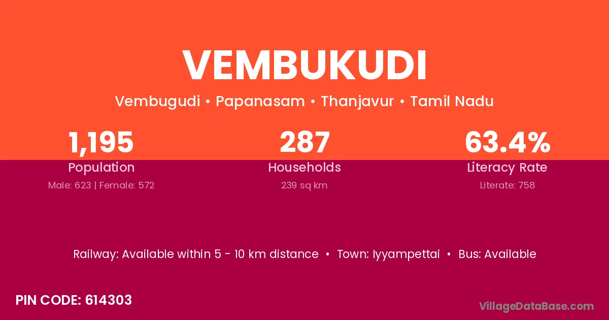 Vembukudi village has a total population of 1,195 people, of which 623 are males and 572 are females.