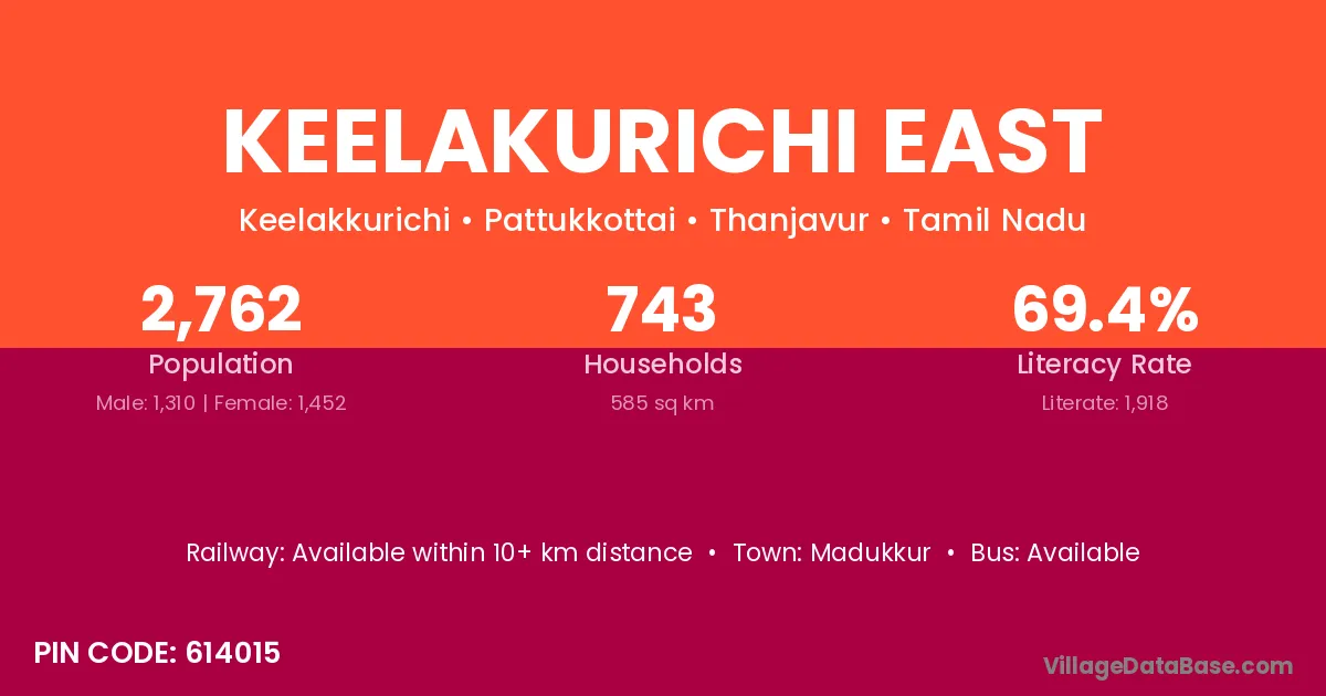 The literacy rate of Keelakurichi East village is 69.44%. Male literacy stands at 76.56% and female literacy at 63.02%.